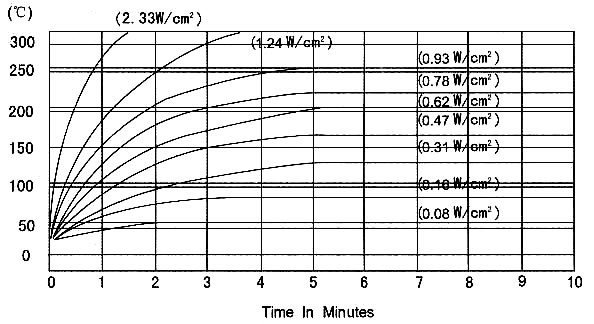 這個圖闡述了當加熱器未絕緣且垂直置于20℃的靜止空氣中時,一個硅橡膠加熱器達到的表面溫度。這個數(shù)據(jù)是基于1.4mm厚的標準結(jié)構(gòu)并作為參考工具提供。